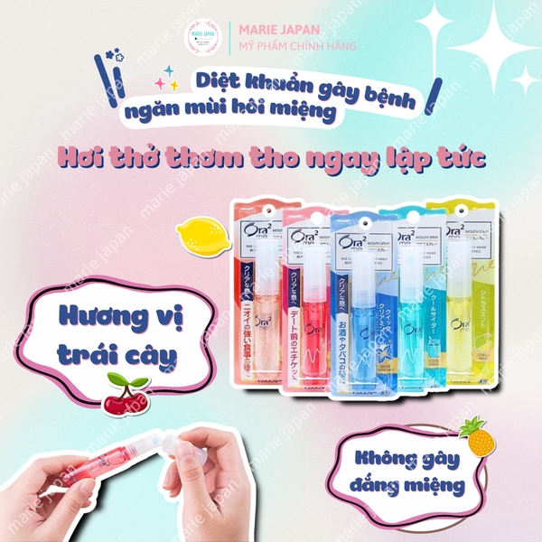 - Nước xịt thơm miệng Ora 2 dạng sương nhẹ, có khả năng tiêu diệt tối đa vi khuẩn gây hôi miệng giúp hơi thở thơm tho và tự tin. Đồng thời, khả năng ngăn n.g.ừ.a vi khuẩn hình thành sau khi ăn uống và hút thuốc và hương thơm mát cho bạn sự tự tin và thoải mái đến không ngờ.